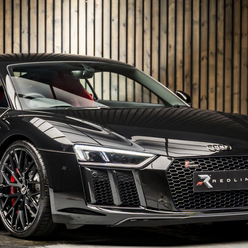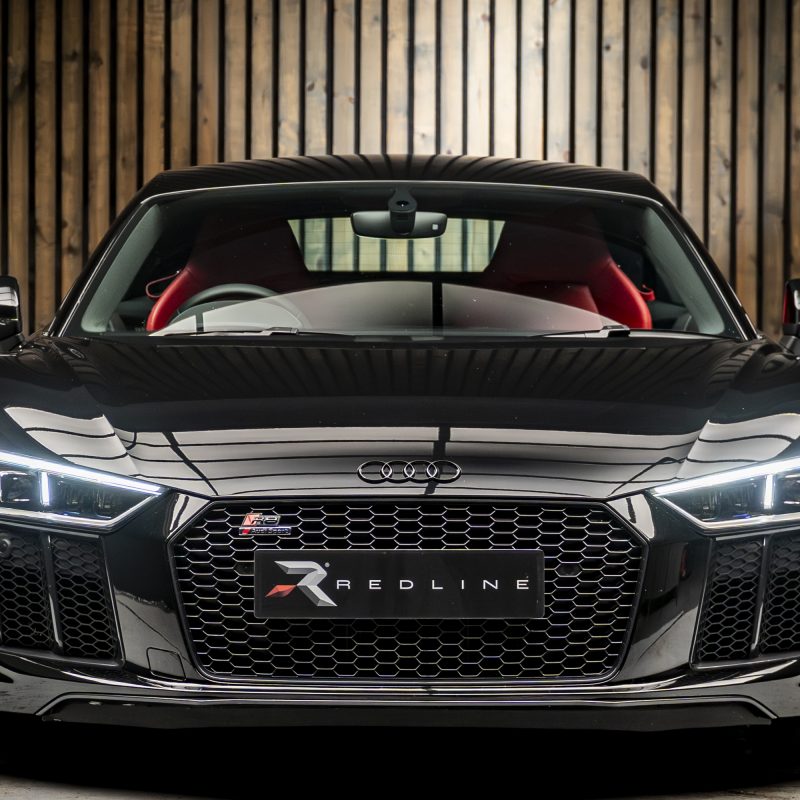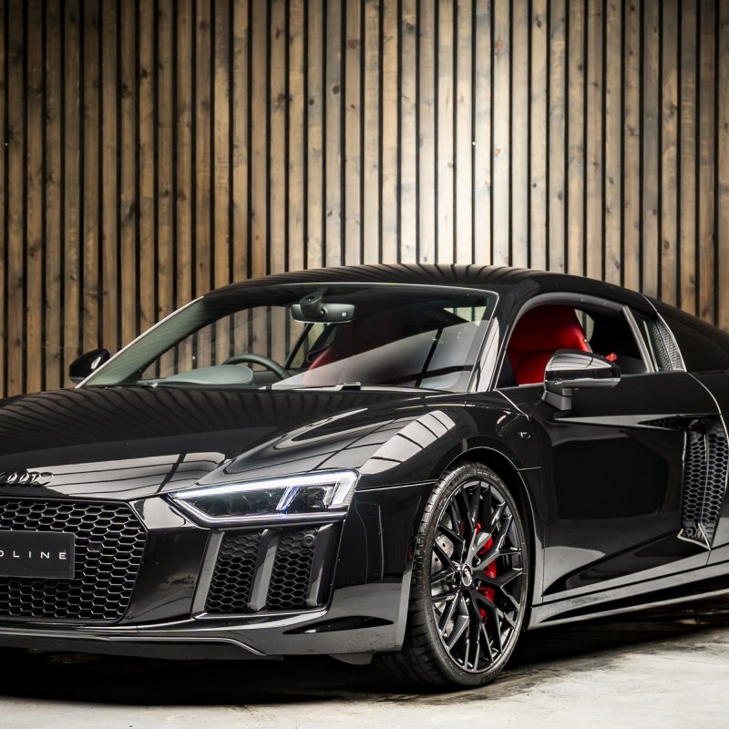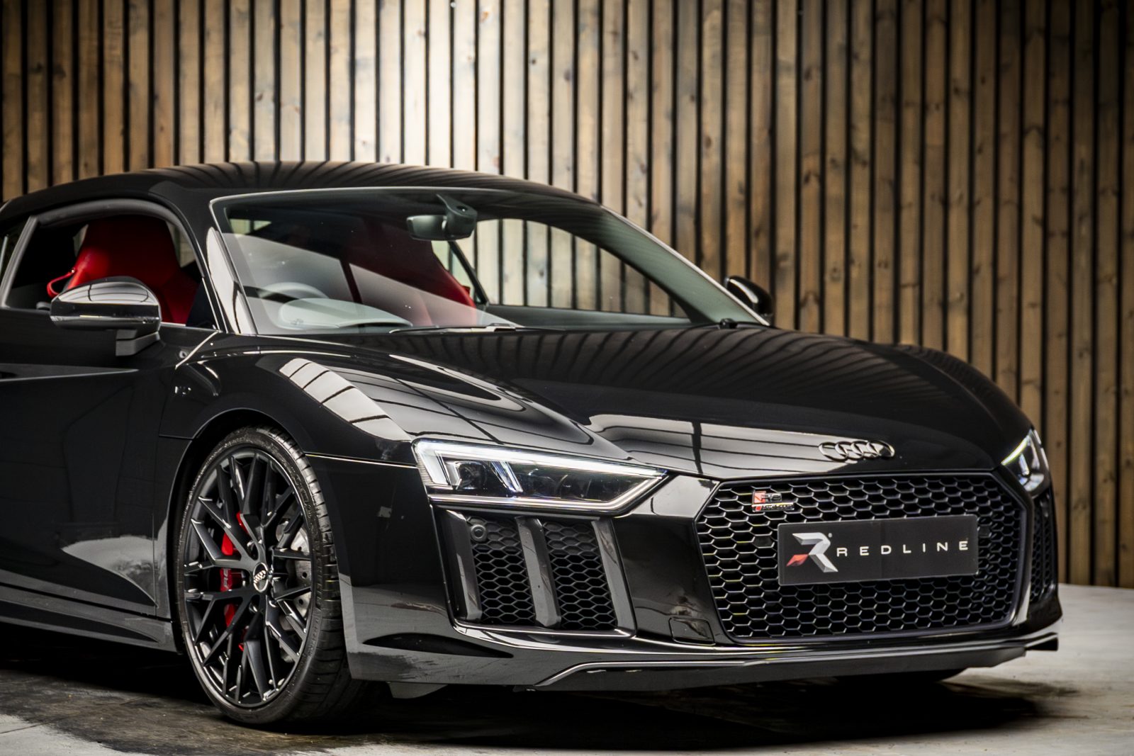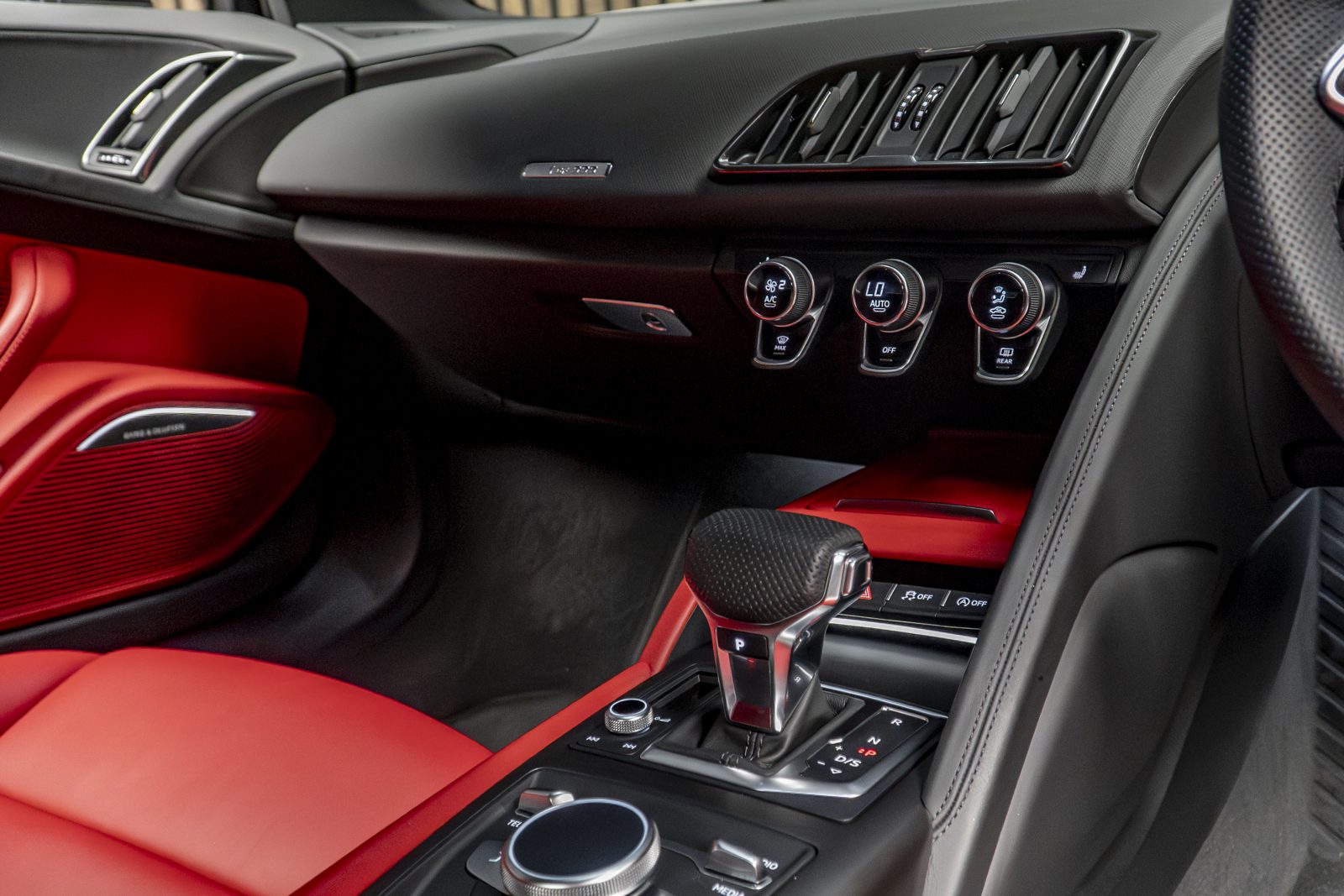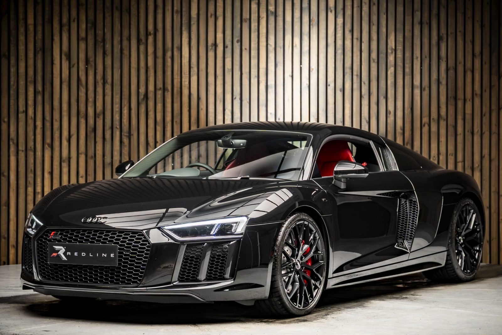 This is a proper supercar. A stunning 2019 Audi R8 5.2 FSI V10 S Tronic, finished in Mythos Black Metallic with a striking Express Red Fine Nappa Leather interior.