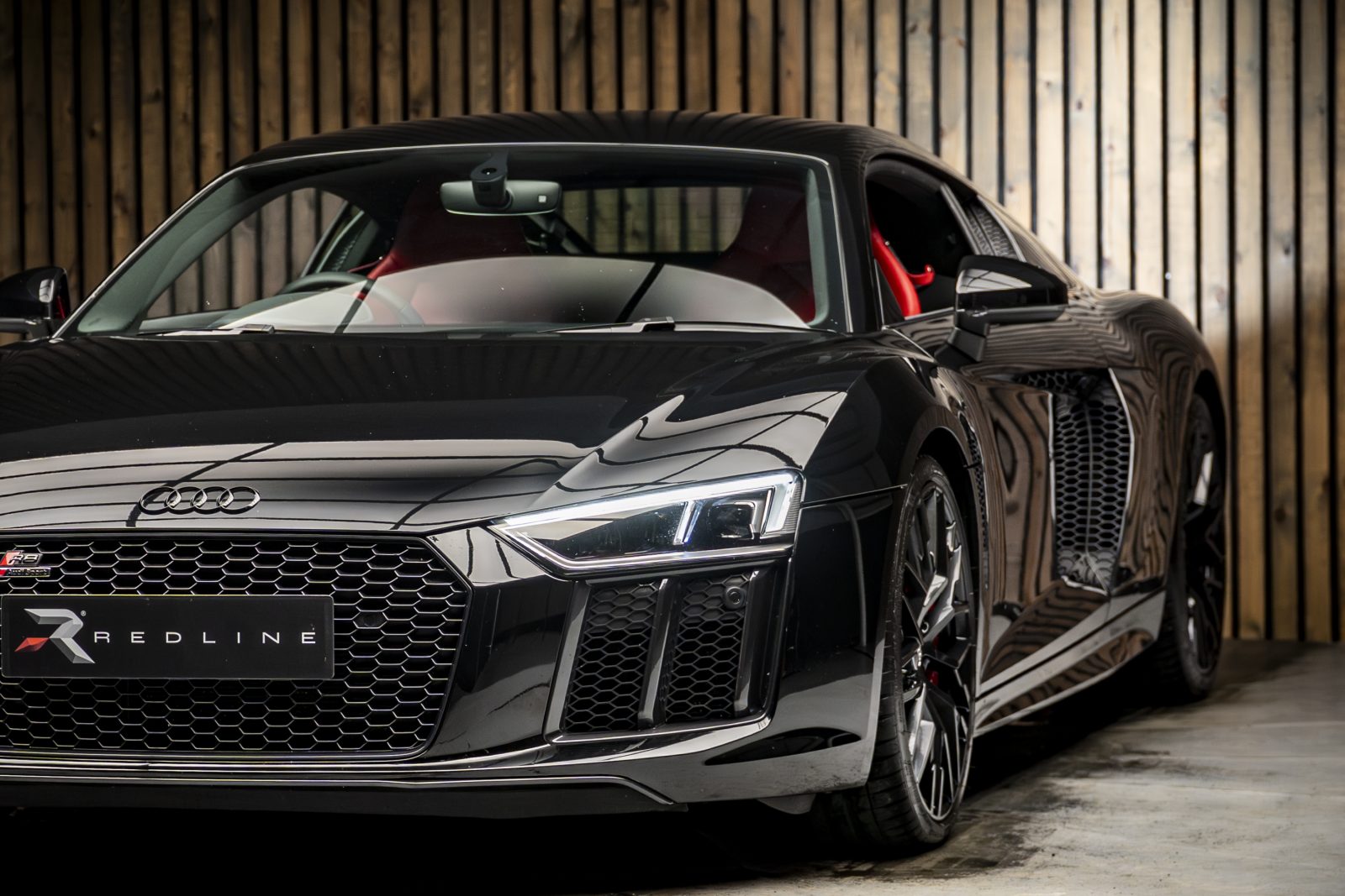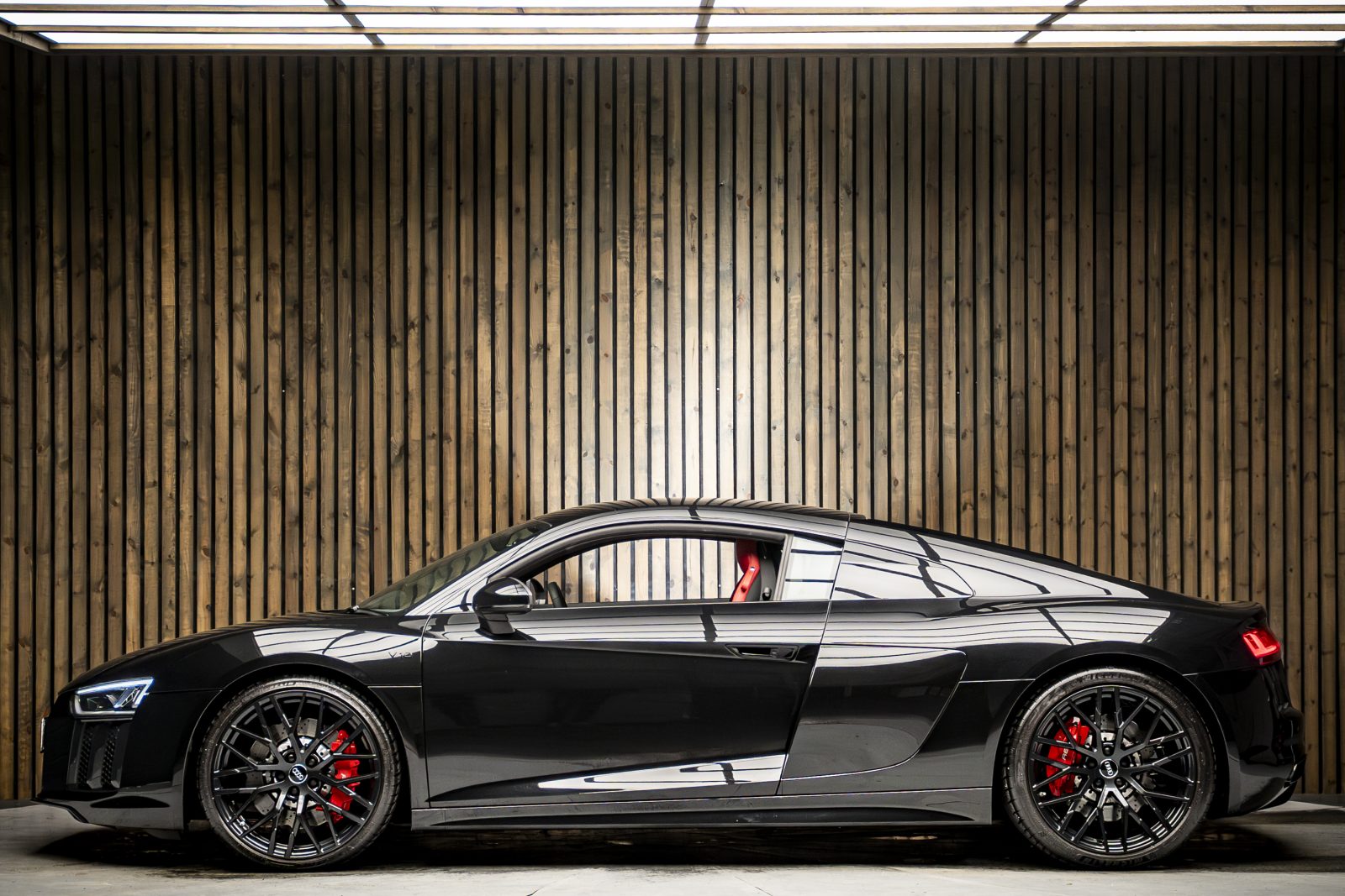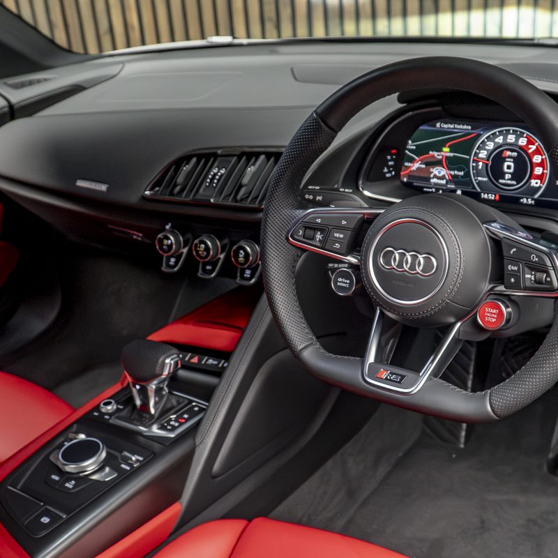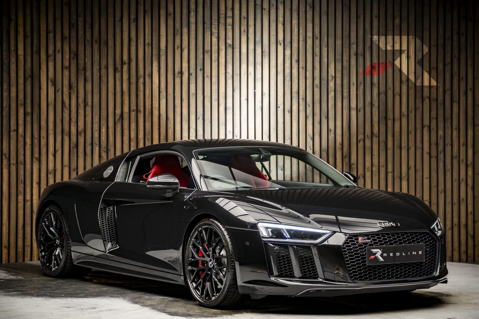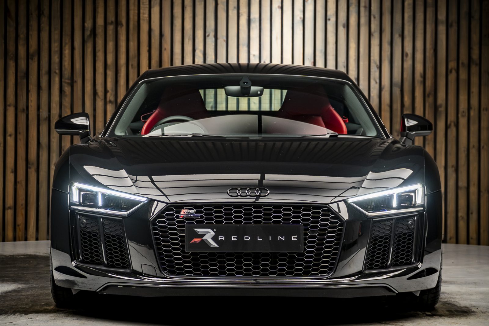 This is a proper supercar. A stunning 2019 Audi R8 5.2 FSI V10 S Tronic, finished in Mythos Black Metallic with a striking Express Red Fine Nappa Leather interior.
