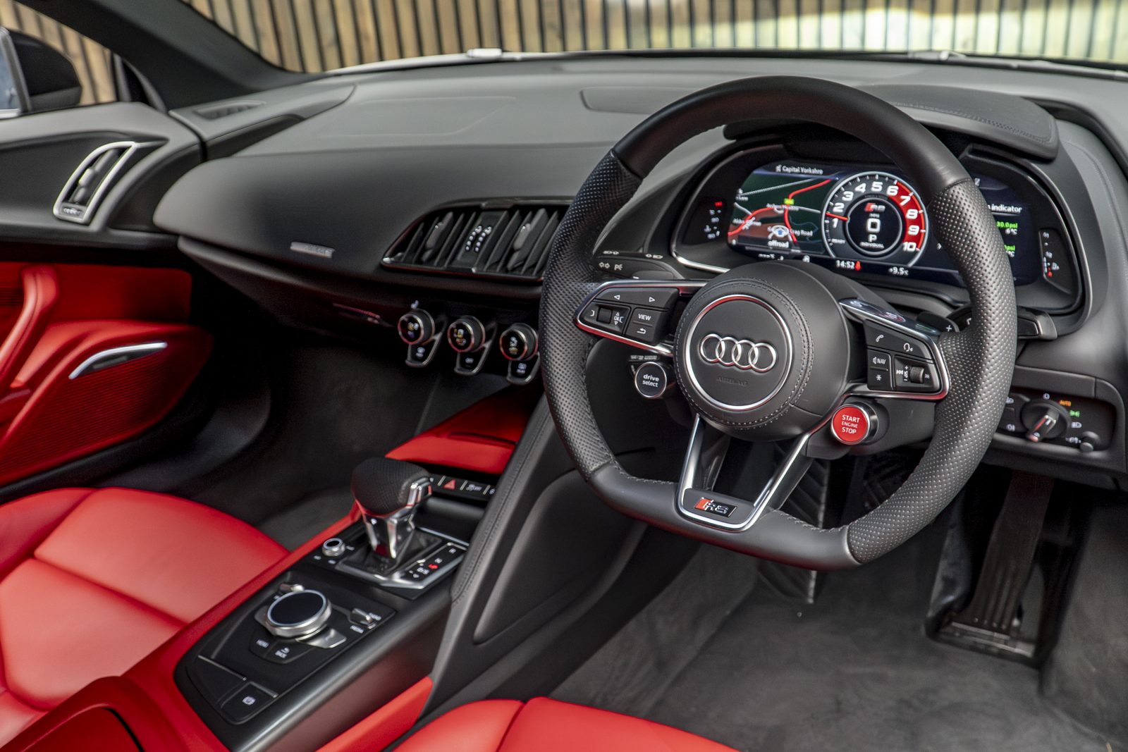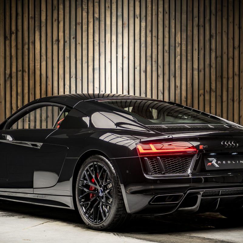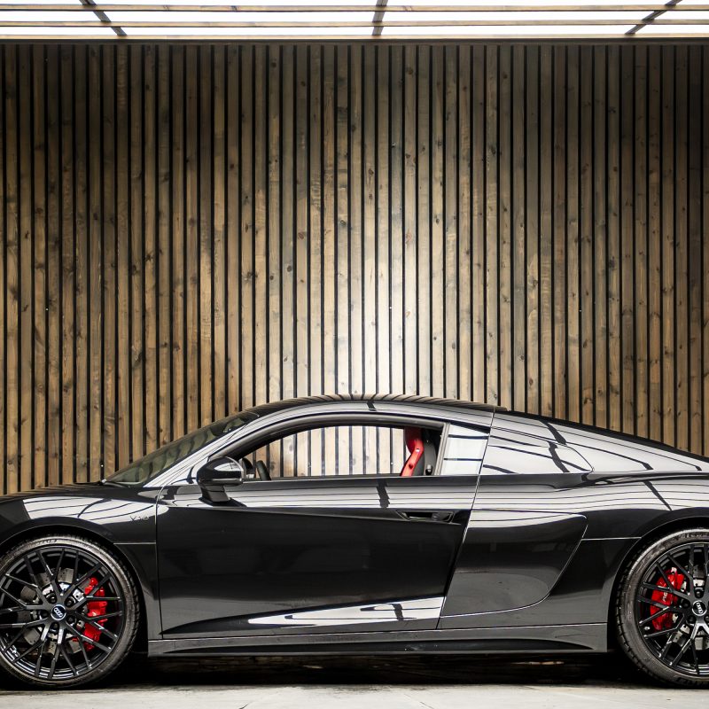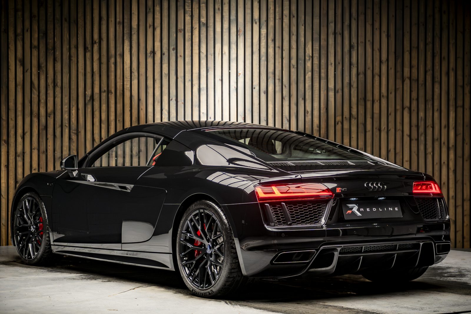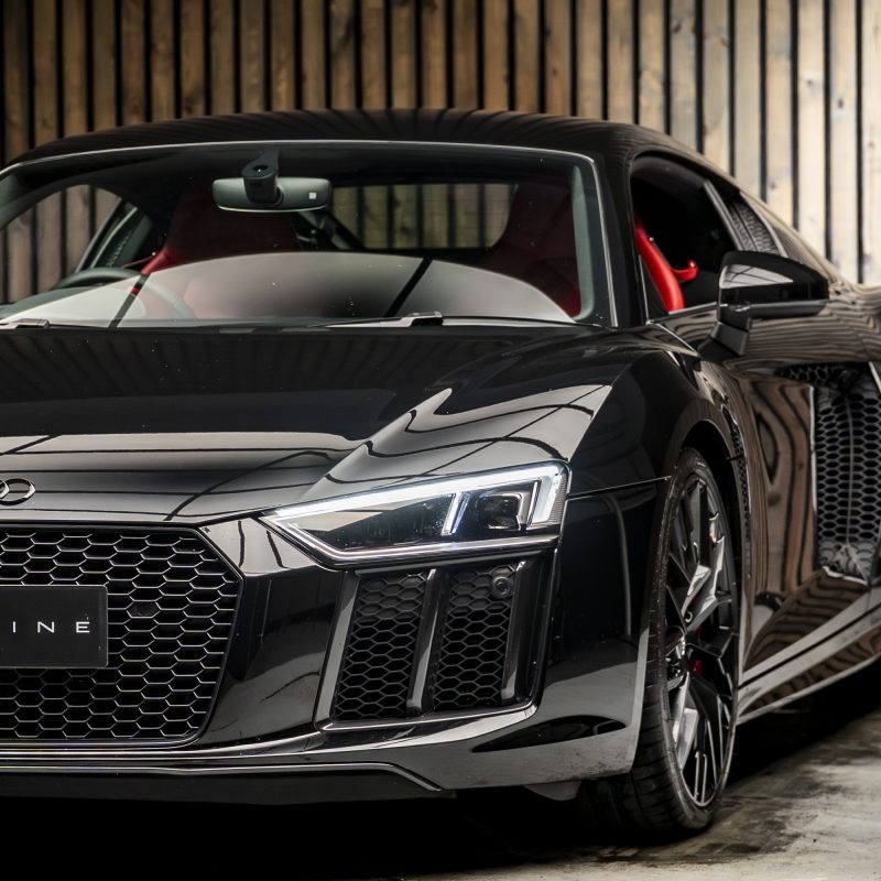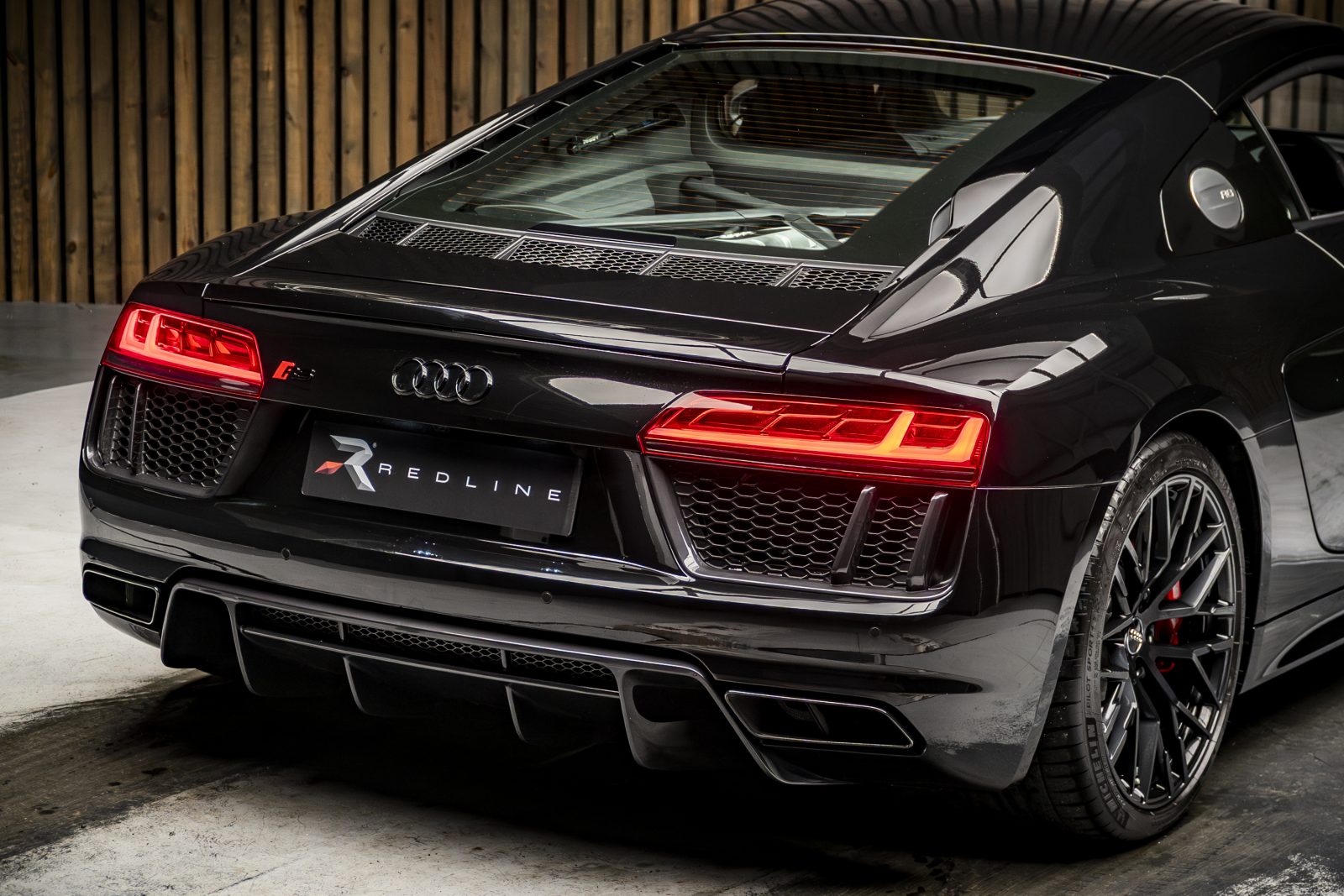 This is a proper supercar. A stunning 2019 Audi R8 5.2 FSI V10 S Tronic, finished in Mythos Black Metallic with a striking Express Red Fine Nappa Leather interior.