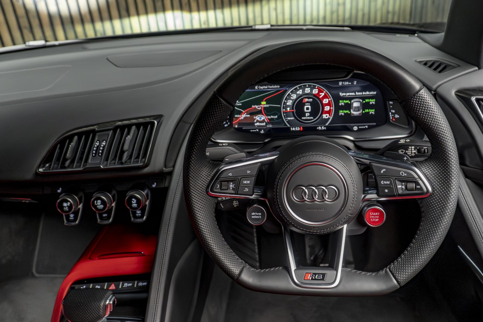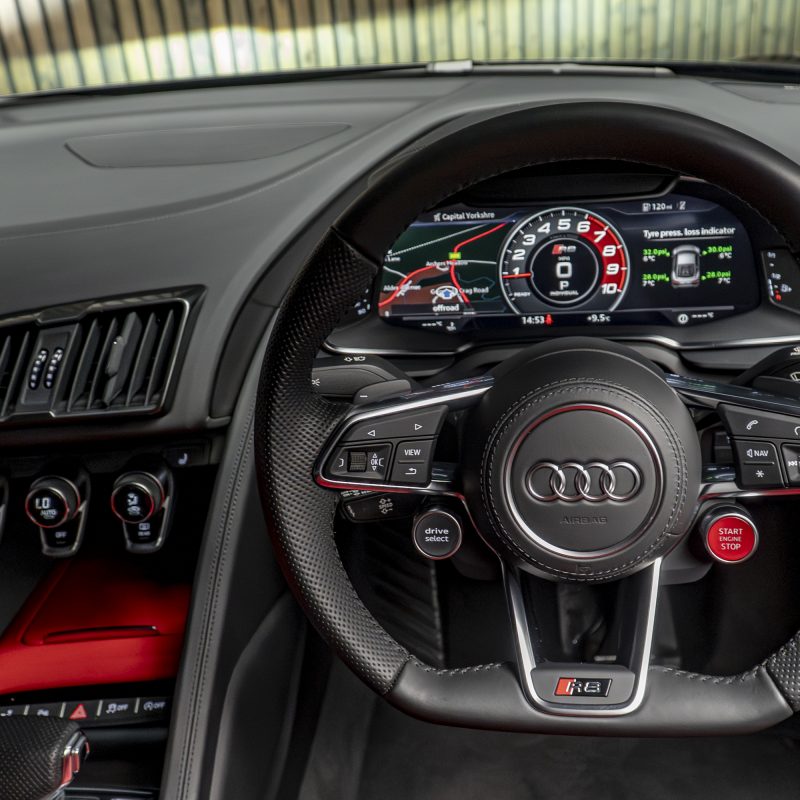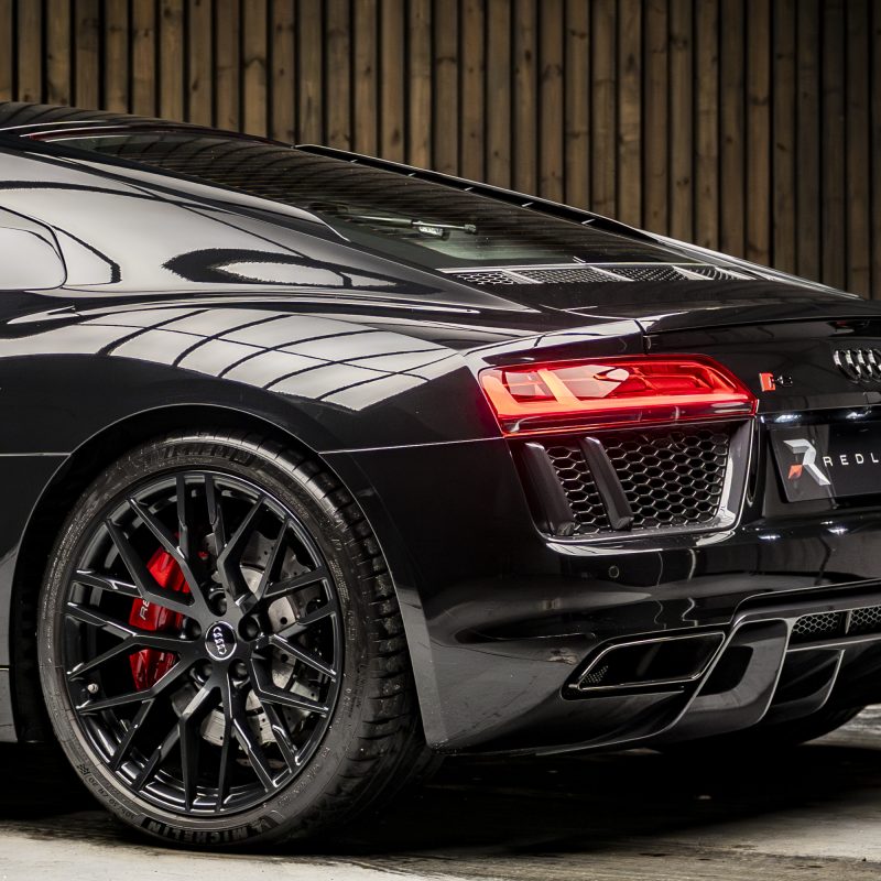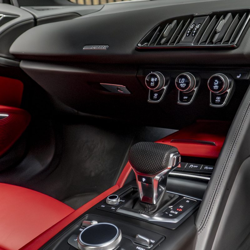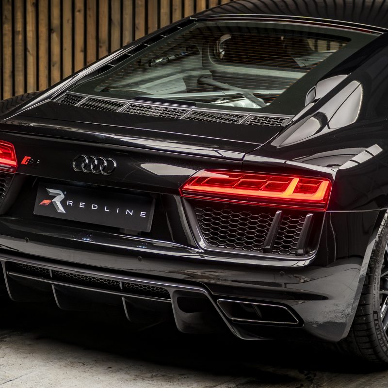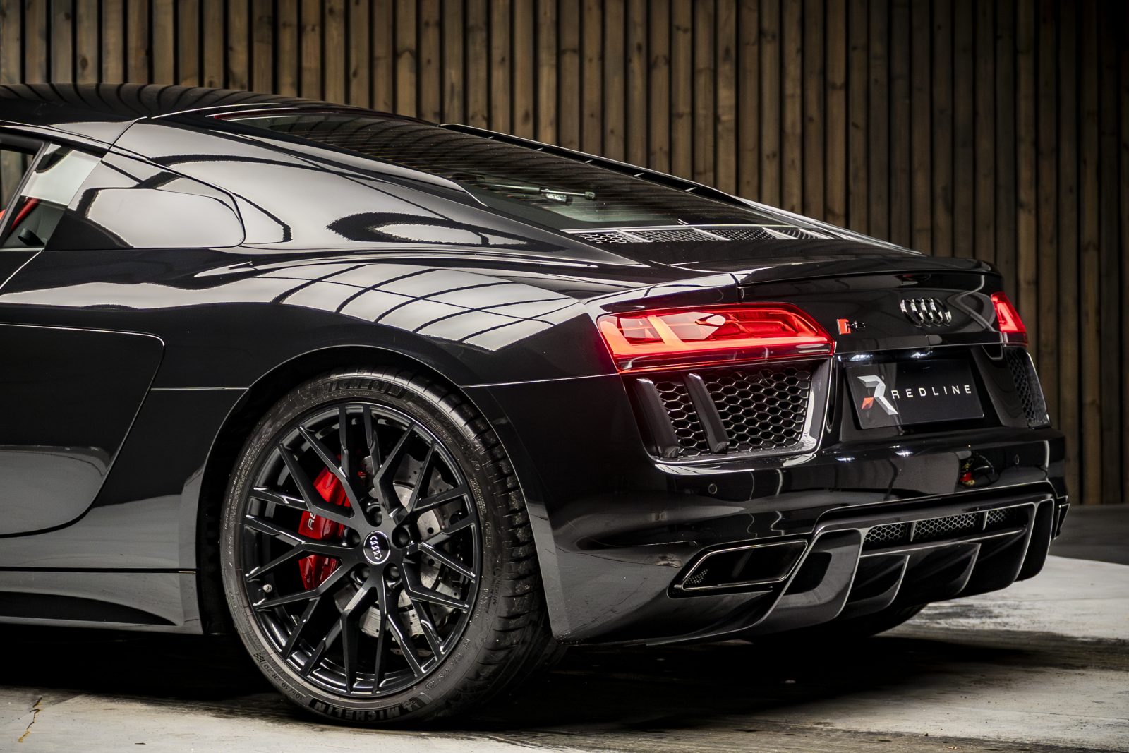 This is a proper supercar. A stunning 2019 Audi R8 5.2 FSI V10 S Tronic, finished in Mythos Black Metallic with a striking Express Red Fine Nappa Leather interior.