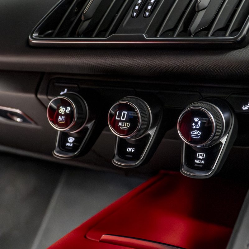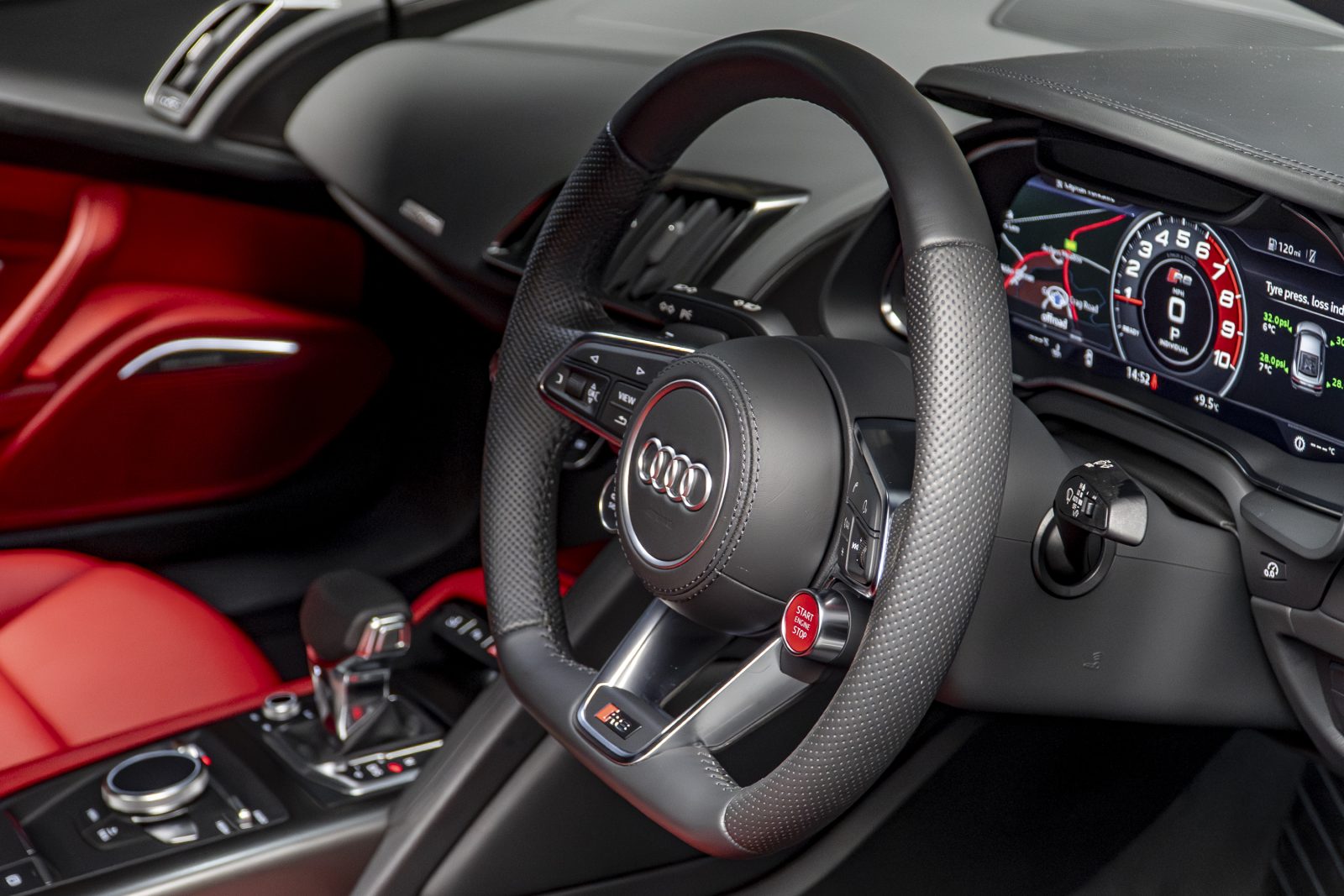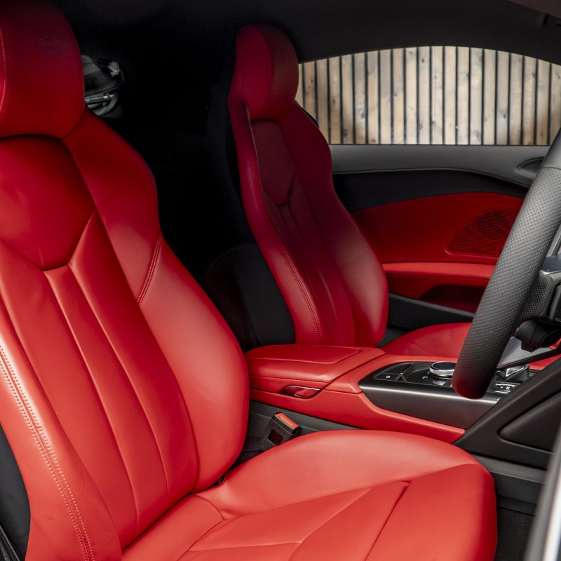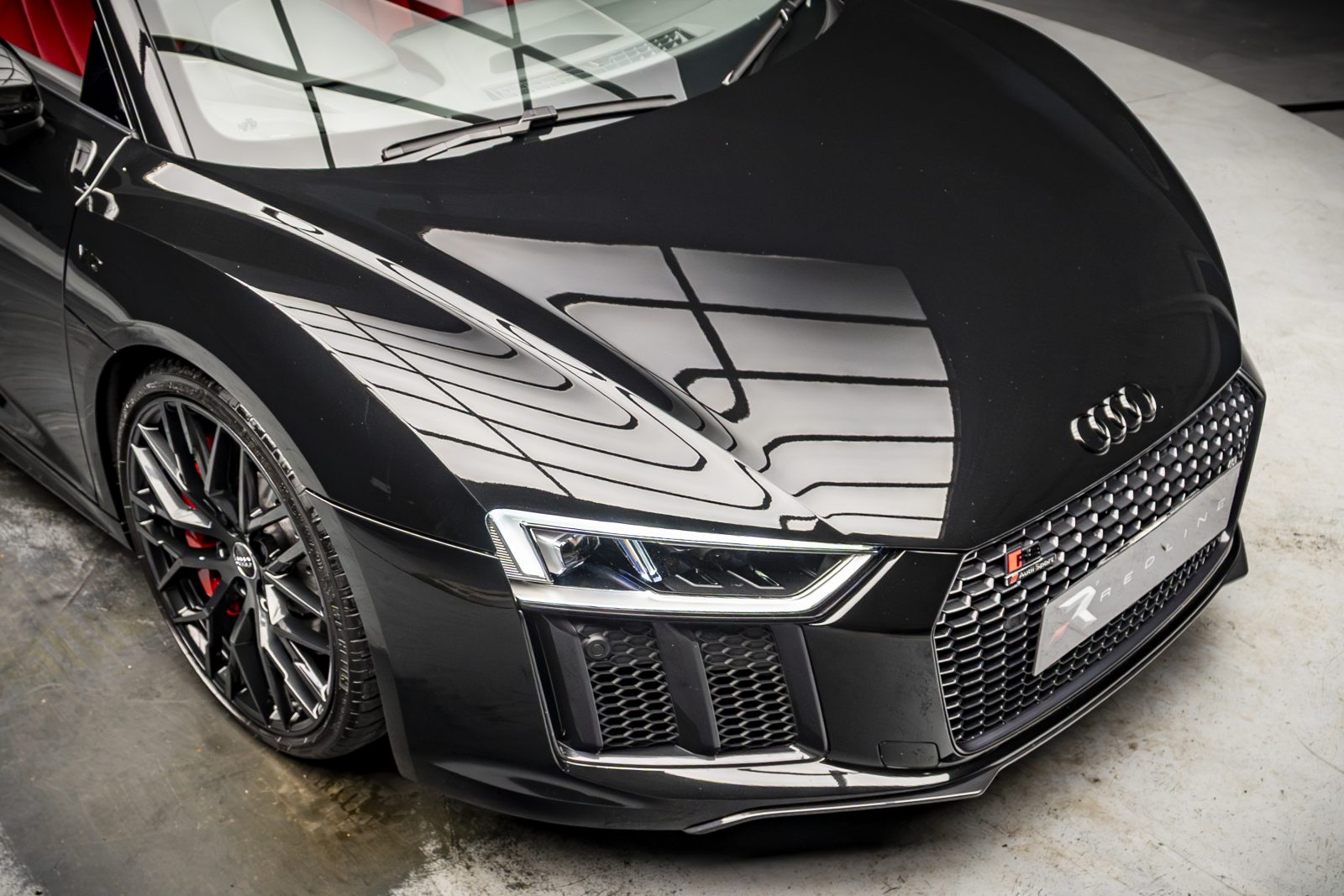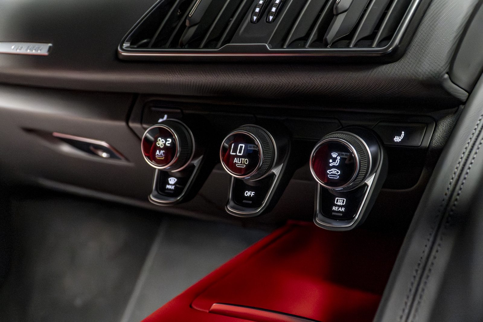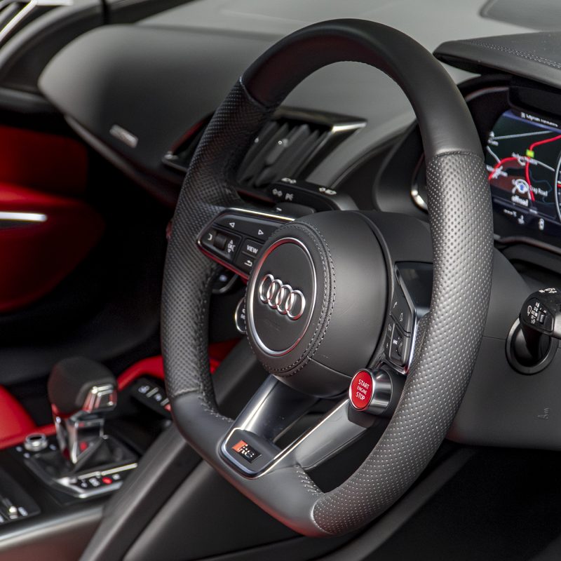 This is a proper supercar. A stunning 2019 Audi R8 5.2 FSI V10 S Tronic, finished in Mythos Black Metallic with a striking Express Red Fine Nappa Leather interior.