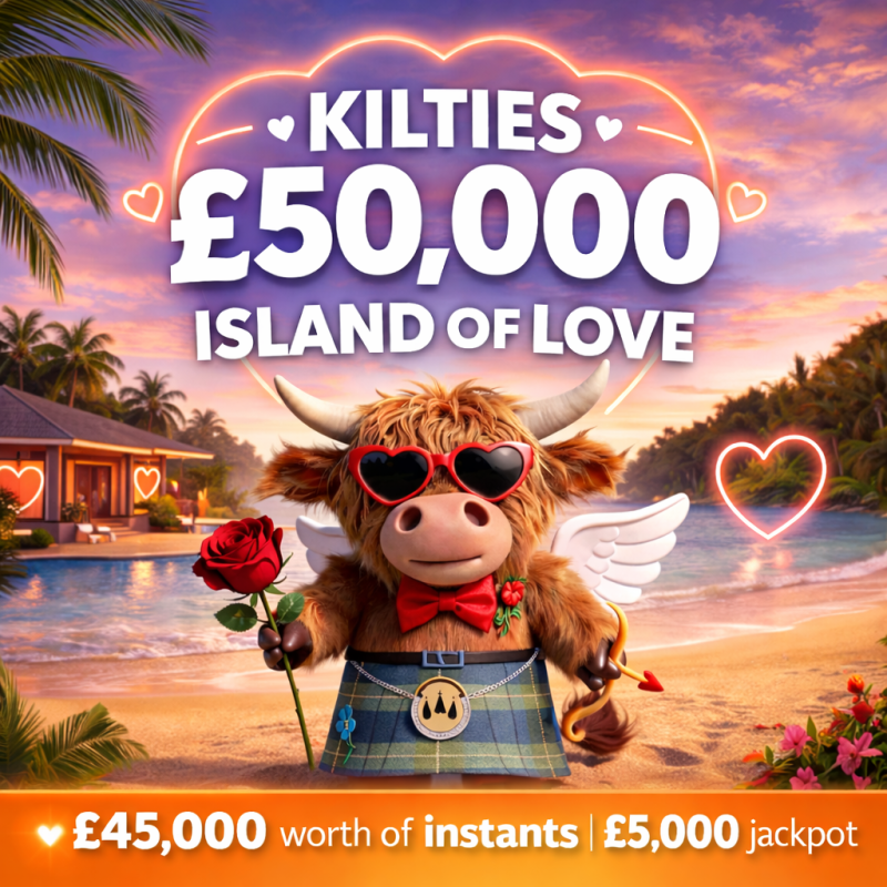 Welcome to Kilties Β£50,000 Island of Love, where one lucky ticket could find the Β£5,000 CASH JACKPOT β and up to Β£45,000 in instant wins are ready to be revealed.