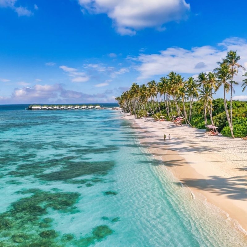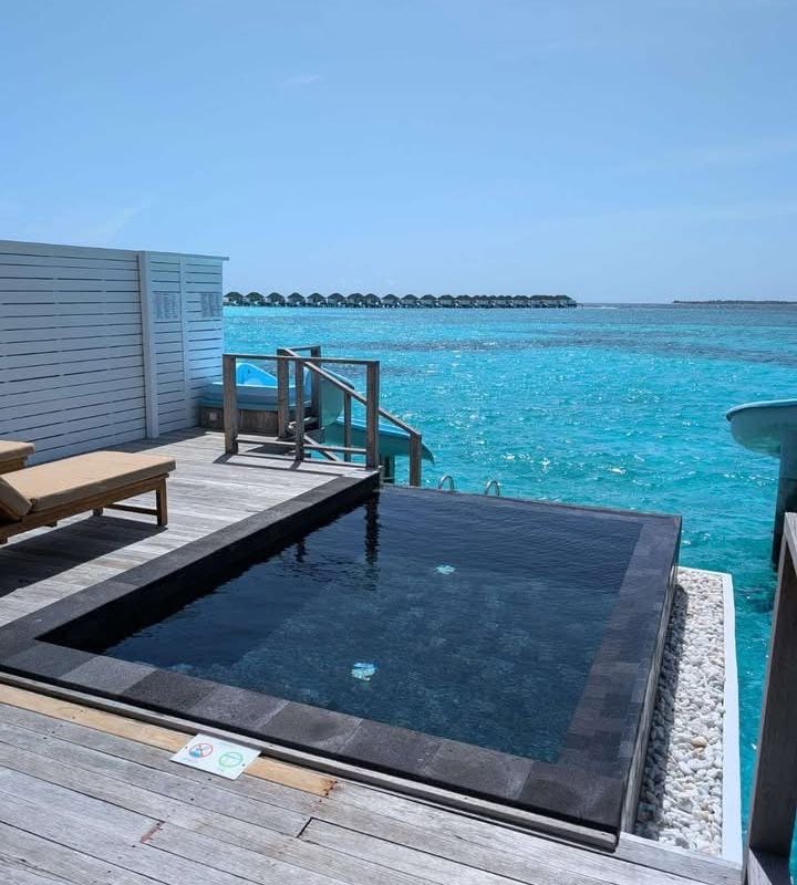 This hotel’s spread across an entire island, beach bungalows pepper the shoreline and water villas spread out over the sea.